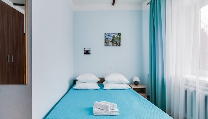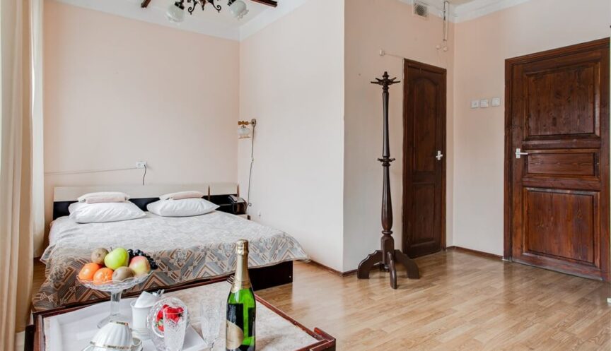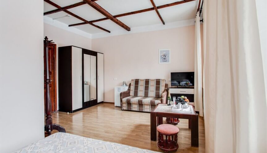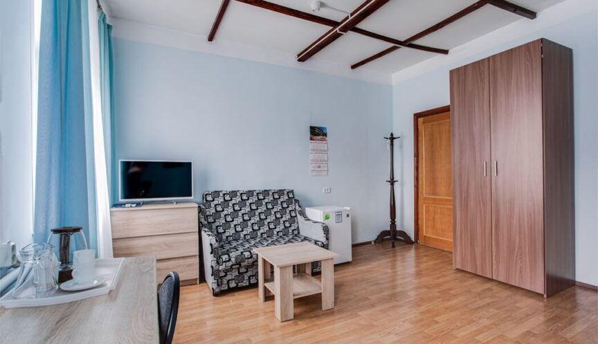 Уютный однокомнатный номер повышенной комфортности с раскладным диваном, кондиционером, холодильником и электрочайником. В номере могут разместиться до трех человек.